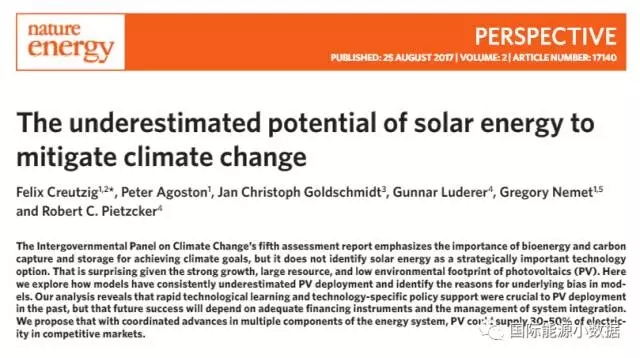 中國儲能網訊:德國墨卡托研究所(Mercator Research Institute)的研究人員在最近一期《自然·能源》雜志上發(fā)表題為“The underestimated potential of solar energy to mitigate climate change”(太陽能減緩氣候變化的潛力被低估)。在這篇文章中展示了下面的曲線圖: