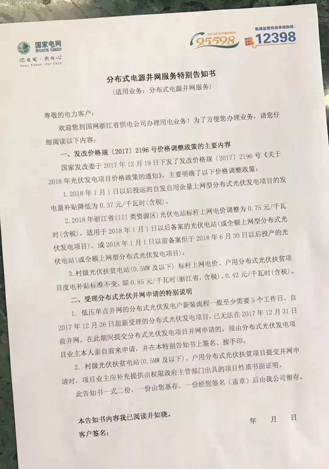 國家電網(wǎng)浙江公司表示,分布式備案最快需要5個工作日,自2017年12月26日新受理的分布式光伏項目,已無法在2017年12月31日前并網(wǎng)。因此,在此期間提交的分布式業(yè)務(wù)需由業(yè)主本人前來申請,并在告知書上簽字、按手印。