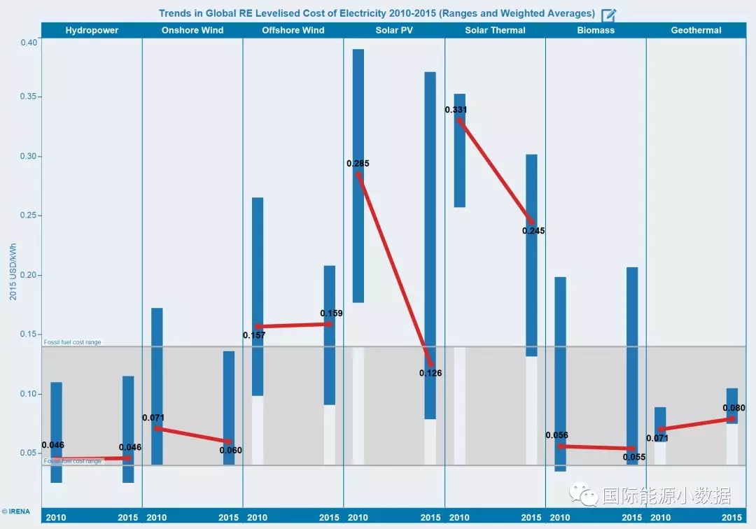 光伏:2010=0.285美元/千瓦時(shí);2015年=0.126美元/千瓦時(shí)——下降幅度55.8%
