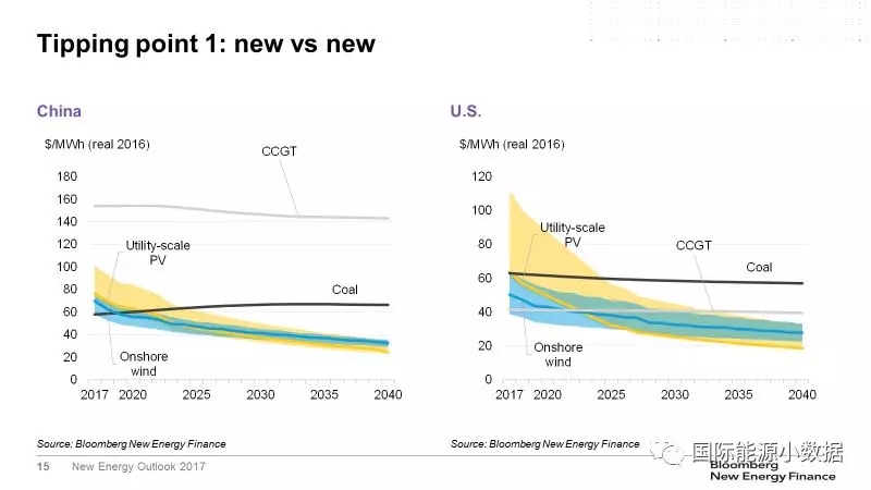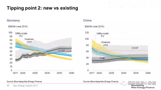 第一個臨界點是:在沒有補貼的情況下,新建風電、光伏電站發(fā)電成本可與新建煤電、天然氣電站競爭。在目前的市場條件下,在很多國家已經(jīng)接近這一臨界點。在德國,新建陸上風電的發(fā)電成本已經(jīng)低于煤電、天然氣發(fā)電;在中國,目前煤電成本在各類電源中依然是最低的,但是預期2019年陸上風電成本將低于煤電、2021年光伏成本也將低于煤電;在美國,天然氣發(fā)電是各類電源中成本最低的,但預計2022-2023年風電、光伏成本均將低于天然氣發(fā)電;在印度,預計2020年起新建光伏將在全國范圍內(nèi)低于煤電。