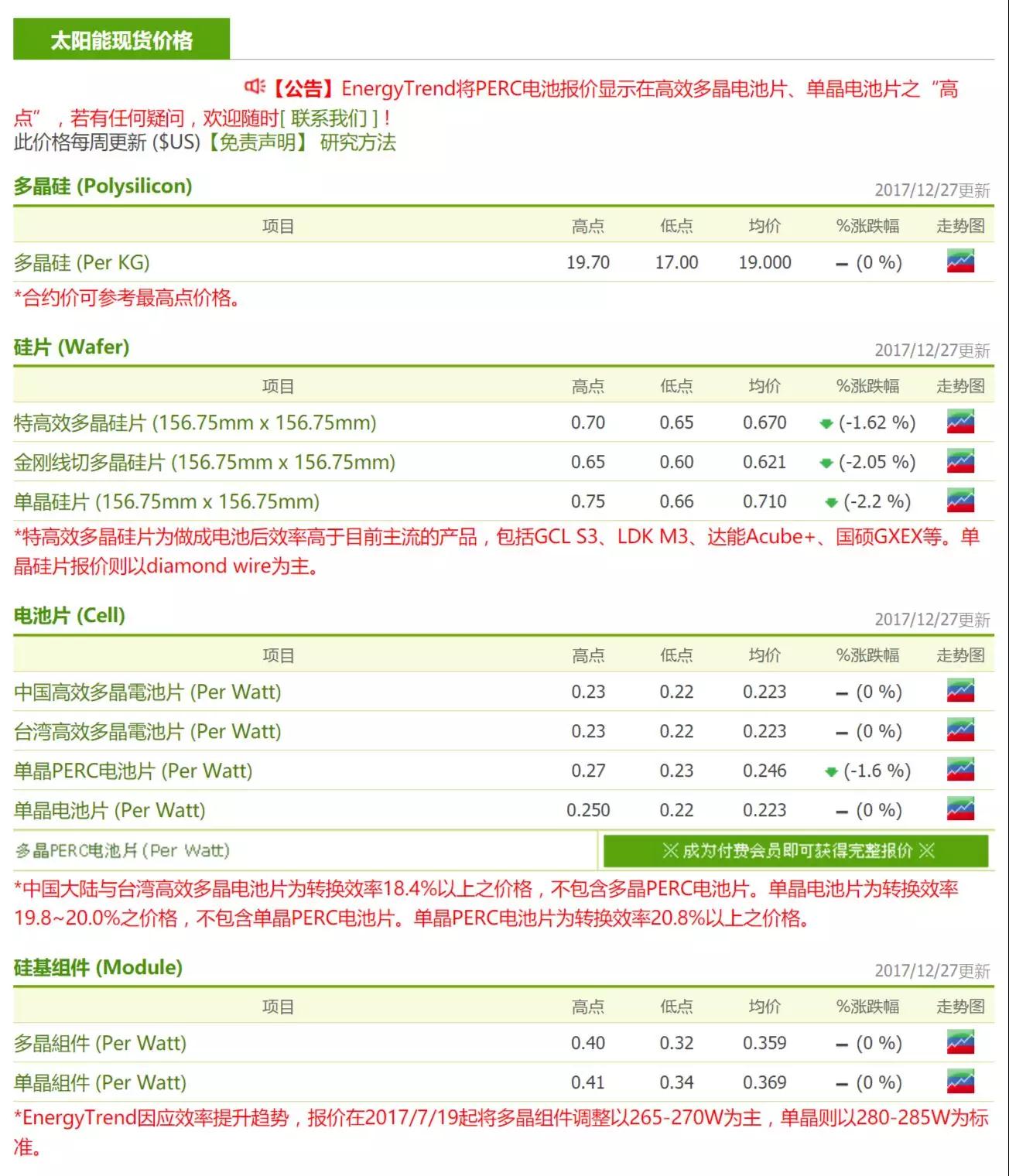 雖然單晶產(chǎn)品的需求開(kāi)始有了起色,但為了在明年第一季拉高單晶產(chǎn)品的競(jìng)爭(zhēng)力,單晶硅片的龍頭廠主動(dòng)調(diào)降單晶硅片價(jià)格RMB 0.2/pc至RMB 5.3-5.4/pc,美元價(jià)格則為USD 0.71-0.72/pc,帶動(dòng)其他單晶硅片廠也調(diào)低報(bào)價(jià)。然而,由于之前單晶市況不佳,市場(chǎng)成交價(jià)與報(bào)價(jià)原就有脫勾,因此本次價(jià)格調(diào)降實(shí)際影響低于RMB 0.12/pc。