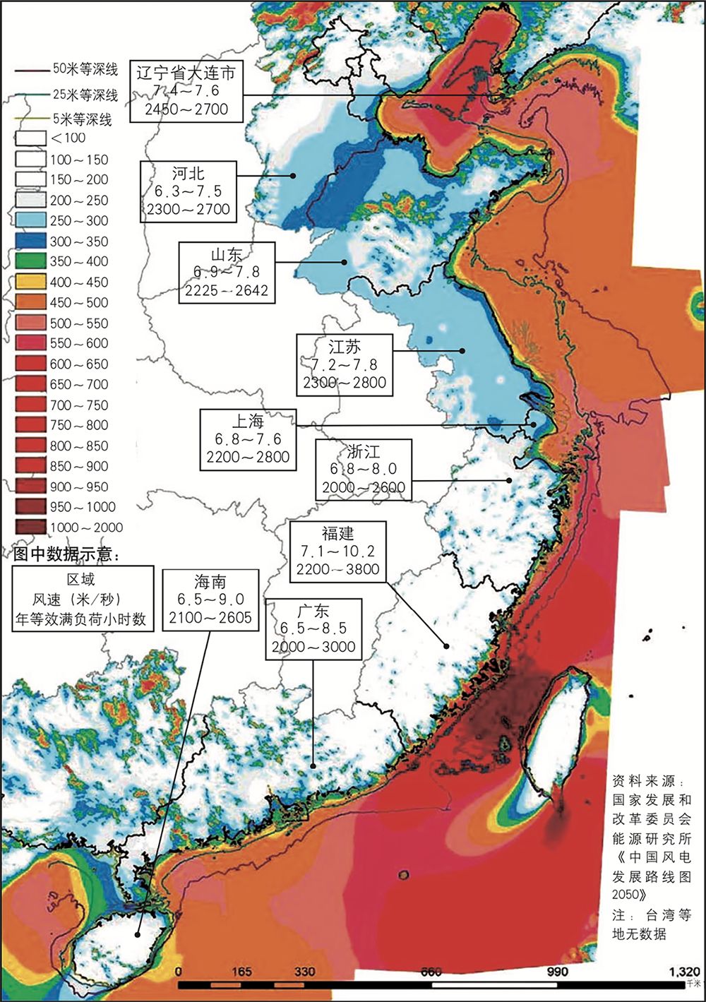 我國沿海各區(qū)域風能資源分布圖