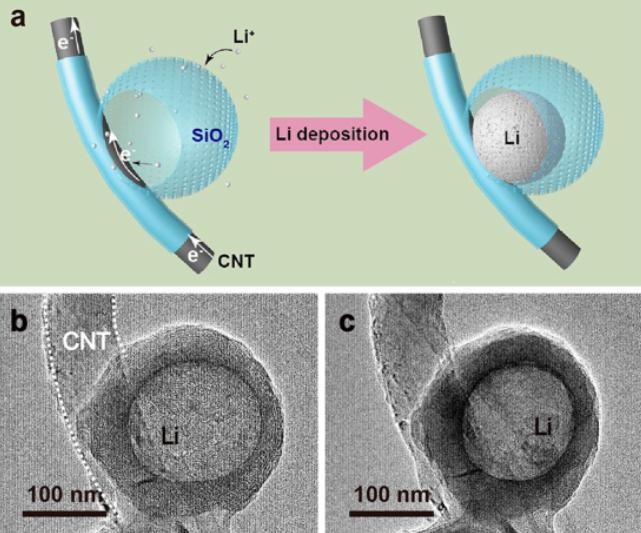 該團(tuán)隊(duì)設(shè)計(jì)了復(fù)合微型籠式結(jié)構(gòu)(composite microcage),搭配碳納米管內(nèi)心(carbon nanotube core)及多孔硅護(hù)層(porous silica sheath)。復(fù)合微型籠式結(jié)構(gòu)可容納鋰金屬,其非均質(zhì)結(jié)構(gòu)可被用作鋰離子捕獲器(trapper)。