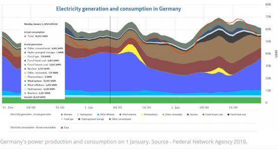 煤炭、天然氣和核能發(fā)電被削減到最低程度,由于電力價(jià)格變?yōu)樨?fù)值,剩余能源出口到鄰國(guó)。
