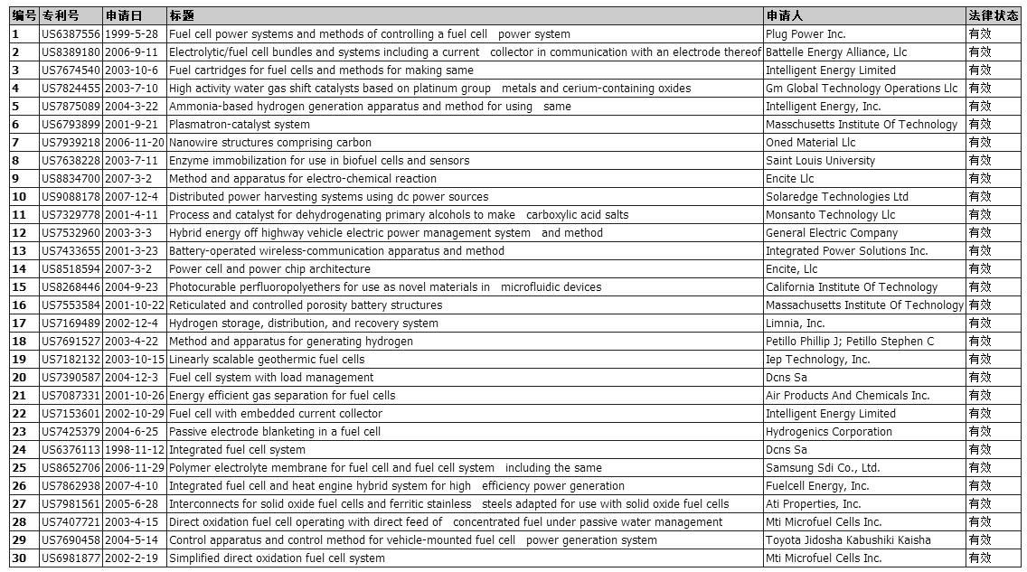 通過使用Innography的專利強(qiáng)度分析,可以從海量專利數(shù)據(jù)中尋找關(guān)鍵專利、核心專利。這些關(guān)鍵專利涉及控制技術(shù)、制氫、儲氫、催化劑、電解質(zhì)膜、燃料電池系統(tǒng)等技術(shù)等,這些專利都集中在美國專利。下表為專利強(qiáng)度為排名前30位的燃料電池技術(shù)專利。
