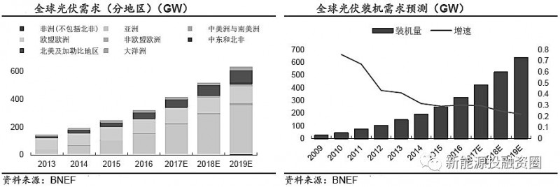 新興國家未來幾年光伏將迎來上升期,地理?xiàng)l件、政策支持將使裝機(jī)需求增幅較大。但總體量上對(duì)全球影響還是很小。2018 年全球裝機(jī)增加仍主要依靠中國、印度等光伏大國。