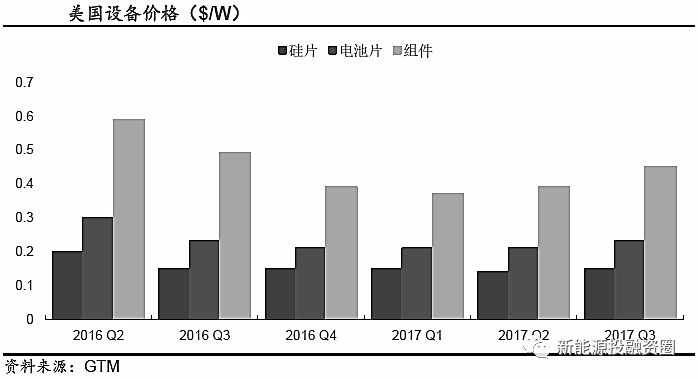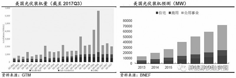 2017 年美國整體光伏裝機(jī)表現(xiàn)良好:17 年第一季度的安裝量為2044MWdc,比去年同期略有下滑,但考慮到16 年情況特殊,一季度整體可以。第二季度安裝量為2387MWdc,比去年同比增加8%,創(chuàng)史上二季度安裝量新高。三季度則為2031MWdc,低于去年,主要受政治不確定、設(shè)備價(jià)格上漲影響??傮w來看,2017 美國光伏裝機(jī)量保持穩(wěn)定,預(yù)計(jì)2017 年全年安裝量會(huì)超過8GWdc。