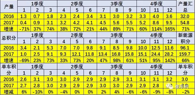 12月的新能源車生產(chǎn)9.5萬臺(tái),形成新能源積分28.2萬分,每臺(tái)乘用車平均3分,較16年12月的3.21分下降89%。17年1-12月新能源乘用車產(chǎn)量54.8萬臺(tái),較2016年增長(zhǎng)71%,而新能源積分達(dá)到160萬分,較16年同期增長(zhǎng)66%。