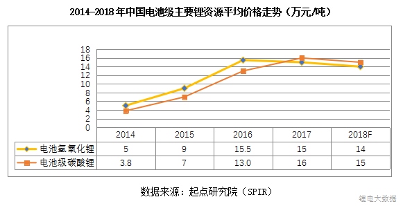 隨著動(dòng)力電池市場(chǎng)爆發(fā),碳酸鋰價(jià)格開(kāi)始大幅上漲,2016-2017年鋰電池碳酸鋰價(jià)格一路走高,最高價(jià)位接近20萬(wàn)元/噸。從2017全年平均值來(lái)看,也達(dá)到了16萬(wàn)元/噸。