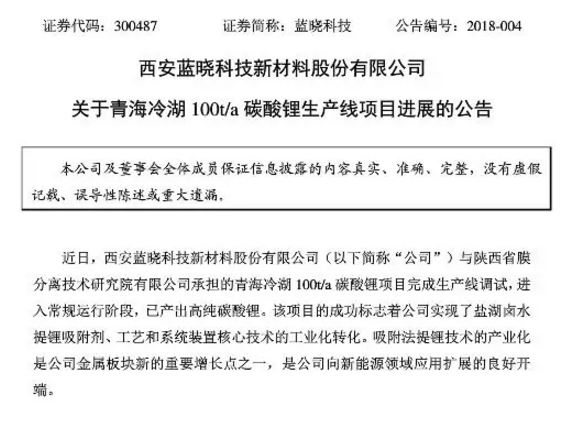 藍(lán)曉科技2018年1月14日晚公告稱,公司與陜西省膜分離技術(shù)研究院有限公司承擔(dān)的青海冷湖100t/a碳酸鋰項(xiàng)目完成生產(chǎn)線調(diào)試,進(jìn)入常規(guī)運(yùn)行階段,已產(chǎn)出高純碳酸鋰。