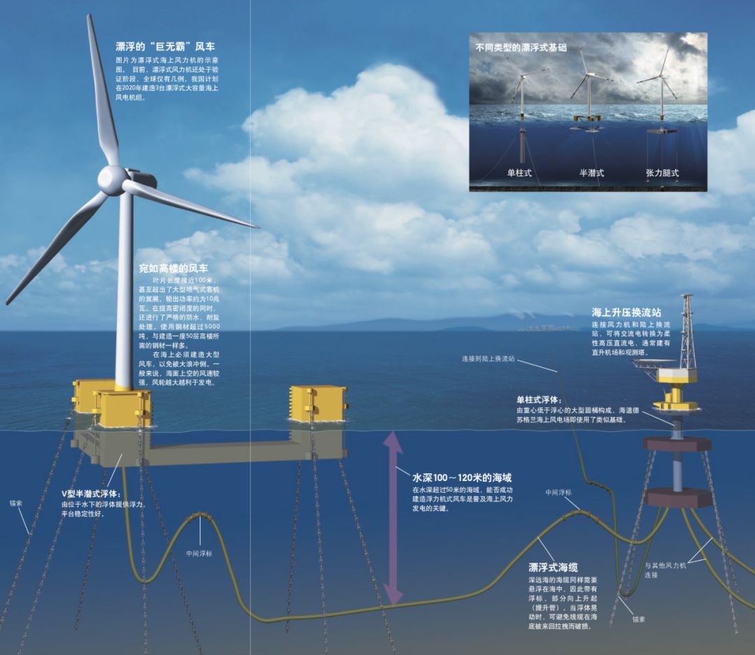 漂浮式基礎的使用,能讓風力機擺脫不同海床條件的束縛,使基礎的設計標準化,最大限度地減少海上作業(yè)。同時它將具有良好的機動性,在需要維修或是躲避臺風時,可以輕易地解除固定的錨索返回港口。2017年10月,全球首個商業(yè)化運行的大型海上漂浮式風電項目—海溫德蘇格蘭(Hywind Scotland)漂浮式風電場已在英國海域投入運行,這個風電場擁有5臺6兆瓦風力機,每座風力機通過長達100余米的漂浮式基礎與3條連接海底的 錨索矗立,總重量高達11200噸。我國也已經(jīng)著手漂浮式風力機的研究,計劃在2019年開建首個海上漂浮式風電項目。