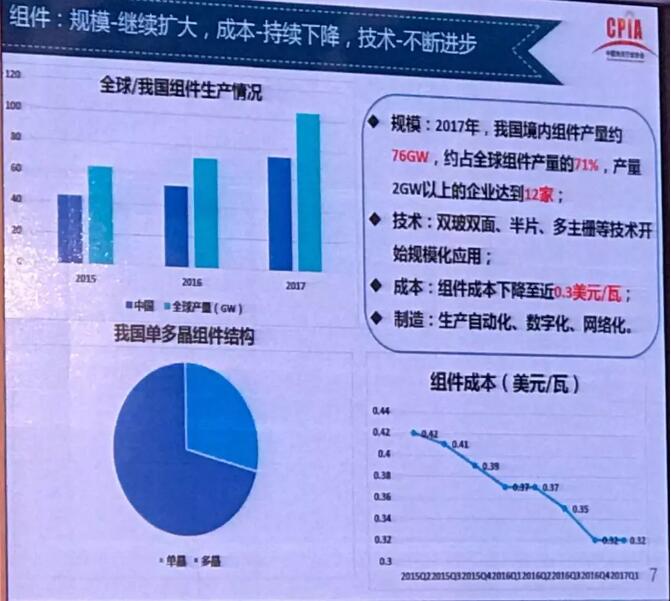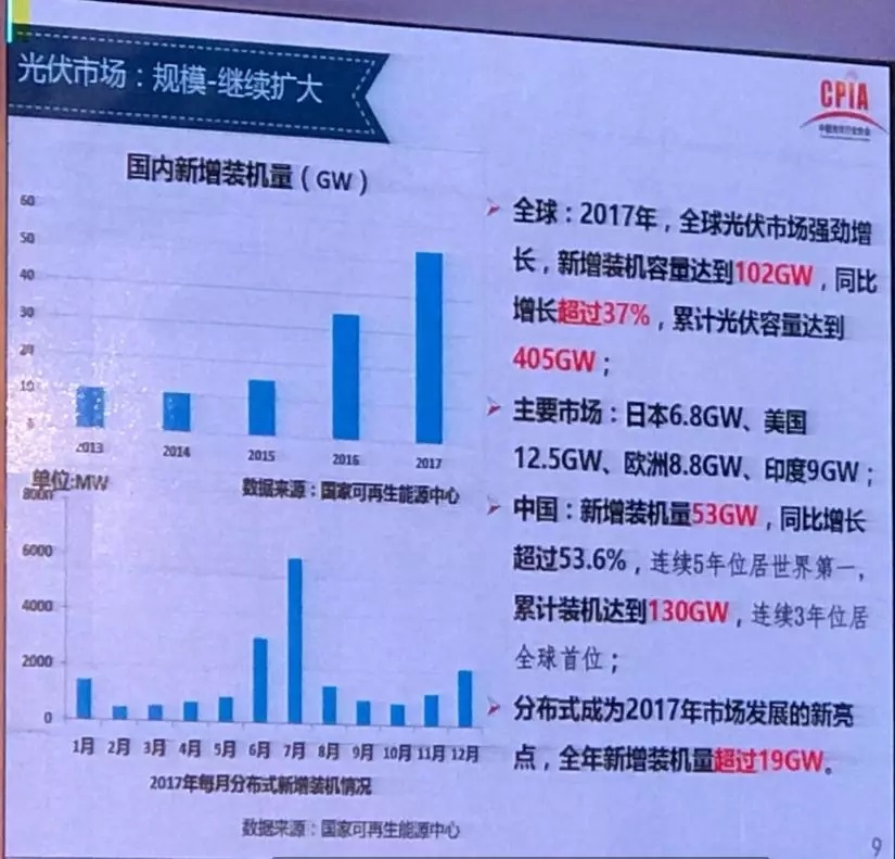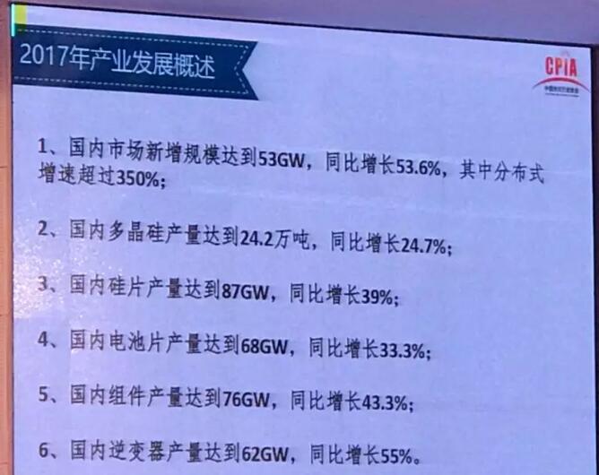中國儲能網(wǎng)訊:1月24日,光伏行業(yè)2017年發(fā)展回顧與2018年展望研討會在京如期舉行。會上,中國光伏行業(yè)協(xié)會副理事長兼秘書長王勃華作了《我國光伏產(chǎn)業(yè)發(fā)展情況——2017年回顧與2018年展望》的報(bào)告。匯報(bào)如下: