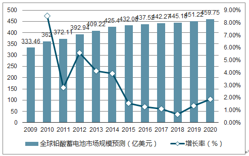 鉛酸蓄電池作為全球市場(chǎng)份額最大的電池類型, 全球市場(chǎng)規(guī)模預(yù)計(jì)仍將保持持續(xù)增長(zhǎng)。2015 年全球鉛酸蓄電池市場(chǎng)規(guī)模較上年增長(zhǎng) 1.57%,達(dá)到 432.08 億美元,預(yù)計(jì)未來(lái) 5 年將基本維持 1%-2%增長(zhǎng)速度。