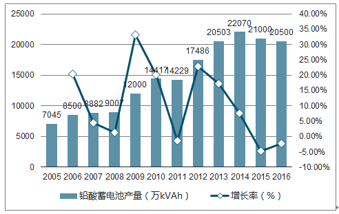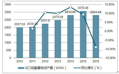 在“十三五”期間鉛酸蓄電池產(chǎn)量預(yù)計(jì)復(fù)合增長(zhǎng)率為 10.76%,至 2020 年鉛酸蓄電池產(chǎn)量達(dá)到 35,000 萬(wàn) kVAh。近年來(lái),通過(guò)行業(yè)持續(xù)的技術(shù)引進(jìn)、消化、吸收和歐、美、日、韓等國(guó)家在我國(guó)的投資建廠,我國(guó)鉛酸蓄電池主要類產(chǎn)品的制造技術(shù)已經(jīng)接近國(guó)際先進(jìn)水平。目前,我國(guó)已成為全球鉛酸蓄電池生產(chǎn)、消費(fèi)和出口大國(guó)。近年來(lái),我國(guó)出口鉛酸蓄電池產(chǎn)量保持較快速度增長(zhǎng),2015 年出口產(chǎn)量為 3,078.48 萬(wàn) kVAh,同比增長(zhǎng) 9.44%,2016 年出口產(chǎn)量下滑產(chǎn)量為 2,804.49 萬(wàn) kVAh,同比下降 8.90%。