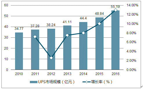 UPS 電源是 UninterruptablePowerSupply 的英文縮寫,即不間斷電源,作為一種具有儲(chǔ)能裝置的電子交流變換系統(tǒng),其基本功能是在中斷供電時(shí),能不間斷供電,始終向負(fù)載提供高質(zhì)量的交流電源,達(dá)到穩(wěn)壓、穩(wěn)頻、抑制浪涌、尖峰、電噪音、補(bǔ)償電壓下陷、長(zhǎng)期低壓等因素干擾。UPS 電源系統(tǒng)按其應(yīng)用領(lǐng)域可分為信息設(shè)備用 UPS 電源系統(tǒng)和工業(yè)動(dòng)力用UPS 電源系統(tǒng)二個(gè)大類別。信息設(shè)備用 UPS 電源系統(tǒng)主要應(yīng)用于:信息產(chǎn)業(yè)、IT行業(yè)、交通、金融行業(yè)、航空航天工業(yè)等計(jì)算機(jī)信息系統(tǒng)、通訊系統(tǒng)、數(shù)據(jù)網(wǎng)絡(luò)中心等的安全保護(hù)問題,其作為計(jì)算機(jī)信息系統(tǒng)、通訊系統(tǒng)、數(shù)據(jù)網(wǎng)絡(luò)中心等的重要外設(shè),在保護(hù)計(jì)算機(jī)數(shù)據(jù)、保證電網(wǎng)電壓和頻率的穩(wěn)定,改進(jìn)電網(wǎng)質(zhì)量,防止瞬時(shí)停電和事故停電對(duì)用戶造成的危害起到重要的作用。 工業(yè)動(dòng)力用 UPS 電源系統(tǒng)主要應(yīng)用于:工業(yè)動(dòng)力設(shè)備行業(yè)電力、鋼鐵、有色金屬、煤炭、石油化工、建筑、醫(yī)藥、汽車、食品、軍事等領(lǐng)域,其作為電力自動(dòng)化工業(yè)系統(tǒng)設(shè)備、遠(yuǎn)方執(zhí)行系統(tǒng)設(shè)備、高壓斷路器的分合閘、繼電保護(hù)、自動(dòng)裝置、信號(hào)裝置等的交、直流不間斷電源設(shè)備,質(zhì)量直接關(guān)系到電網(wǎng)的安全運(yùn)行,是發(fā)電設(shè)備和輸變電設(shè)備的“心臟”。2016 年我國(guó) UPS 市場(chǎng)規(guī)模預(yù)計(jì)為 55.19 億元,未來(lái)市場(chǎng)將保持較快的增長(zhǎng)速度。