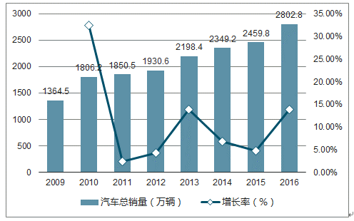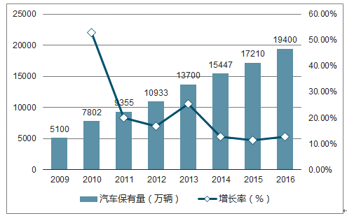 汽車起動(dòng)電池下游市場(chǎng)分為一級(jí)市場(chǎng)(配套市場(chǎng))與二級(jí)市場(chǎng)(維護(hù)市場(chǎng)),在汽車產(chǎn)銷量和保有量持續(xù)增長(zhǎng)的背景下, 汽車起動(dòng)電池市場(chǎng)規(guī)模呈現(xiàn)快速增長(zhǎng)態(tài)勢(shì)。一級(jí)市場(chǎng)是為汽車整車生產(chǎn)廠家提供配套供貨,每輛新車一般配備一只電池。二級(jí)市場(chǎng)是指存量車客戶在車輛維修保養(yǎng)過(guò)程中通過(guò)汽車零配件經(jīng)銷商、汽車 4S 店、蓄電池經(jīng)營(yíng)部和汽車修理店等經(jīng)銷商購(gòu)買蓄電池。汽車起動(dòng)電池屬于汽車零部件中的消耗品,平均壽命約 2 年,因此汽車起動(dòng)電池市場(chǎng)需求數(shù)量為新車銷量與汽車保有量一半之和。我國(guó)汽車銷量從2010年的1,806.2萬(wàn)輛增長(zhǎng)至2016年的2,802.8萬(wàn)輛,年均增長(zhǎng)率為7.60%;我國(guó)汽車保有量從 2010 年 7,802 萬(wàn)輛增長(zhǎng)至 2016 年的 19,400 萬(wàn)輛,年均增長(zhǎng)率達(dá) 16.39%。持續(xù)增長(zhǎng)的汽車銷和存量為汽車起動(dòng)電池的發(fā)展提供了良好的市場(chǎng)環(huán)境。