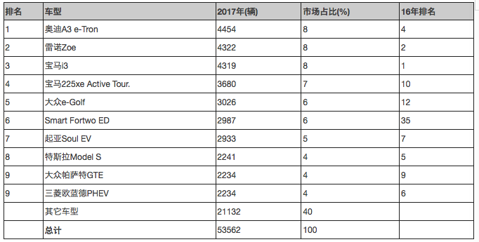 德國市場素以極端穩(wěn)定聞名,但插電式汽車卻走出了與“冰河步伐”完全相反的利基,頻繁的變化讓排行榜單保持著相對的平衡。奧迪A3 e-Tron以4454輛獲得銷售冠軍,但市場份額只占8%,雷諾Zoe排名第二,銷量為4322輛,而2016年的冠軍寶馬i3下滑到第三,僅比第二名少了20輛。