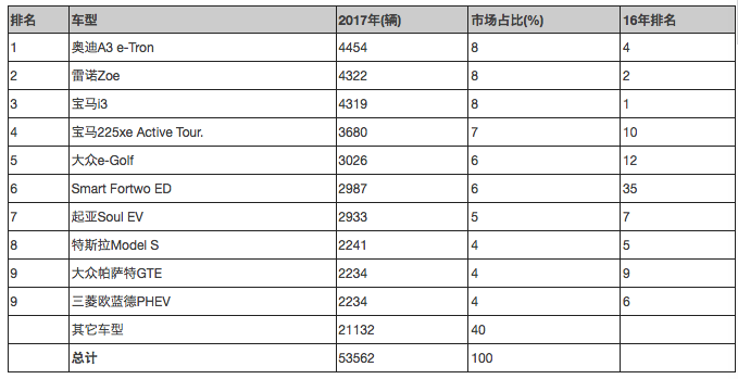 圖表 6 挪威2017年新能源汽車銷量前十