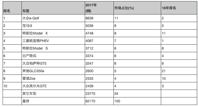 純電動(dòng)車型包攬了2017年暢銷車前三名,大眾e-Golf繼2015年獲得冠軍后再次問鼎,寶馬i3首次在挪威市場取得第二名,特斯拉Model X在12月份超越了三菱歐藍(lán)德PHEV,一舉贏得第三名。