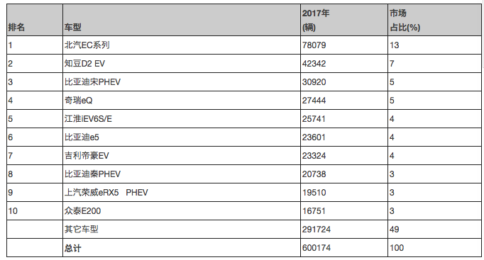 圖表 4 中國2017年新能源汽車銷量前十