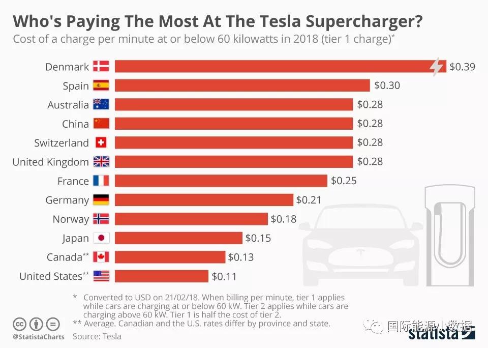 中國儲(chǔ)能網(wǎng)訊:根據(jù)特斯拉的數(shù)據(jù)(統(tǒng)計(jì)專業(yè)網(wǎng)站Statista轉(zhuǎn)載),特斯拉快速充電樁在各國的充電成本不同。以每分鐘充電的價(jià)格(60千瓦以下)計(jì)算,丹麥最貴(0.39美元),其次是西班牙(0.30美元),中國(0.28美元,合人民幣1.8元)與澳大利亞、瑞士、英國相當(dāng)。在特斯拉的主場(chǎng)美國充電價(jià)格最便宜(平均0.10美元),比中國充電成本低61%;加拿大(0.13美元)、日本(0.15美元)也屬于充電成本較低的國家。