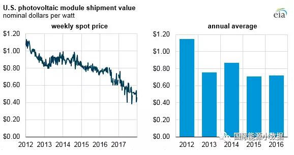 中國儲能網(wǎng)訊:根據(jù)美國能源署(EIA)統(tǒng)計的數(shù)據(jù),2012年美國的光伏組件平均成本1.15美元/Wdc(約合人民幣7.31元/瓦),到2016年平均成本為0.72美元/Wdc(約合4.58元/瓦)。