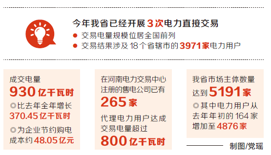 中國儲能網(wǎng)訊:2月28日,河南電力交易中心公布了今年以來電力直接交易的結(jié)果:售電公司、電力用戶與發(fā)電企業(yè)成交電量930億千瓦時,比去年全年增長370.45億千瓦時,為企業(yè)節(jié)約購電成本約48.05億元。