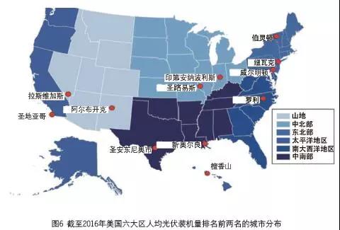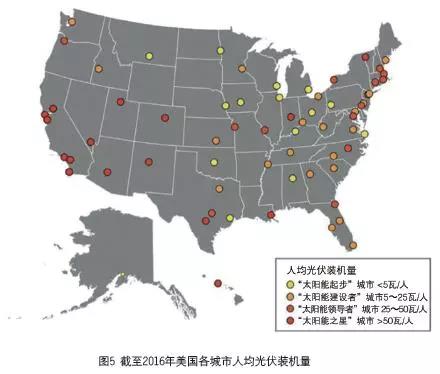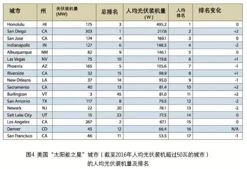 美國的主要城市在清潔能源革命中發(fā)揮了關(guān)鍵作用。作為人口中心,城市是電力需求的主要來源,同時(shí)擁有數(shù)以百萬計(jì)適合安裝太陽能電池板的屋頂。依據(jù)“Shining Cities 2017”報(bào)告,2016年度的數(shù)據(jù)表明,圣地亞哥在太陽能光伏總裝機(jī)方面領(lǐng)先全國,總量為30.3 萬千瓦,其次是洛杉磯(26.7萬千瓦)、檀香山(17.5萬千瓦)、圣何塞(17.4 萬千瓦)、鳳凰城(16.5萬千瓦)。