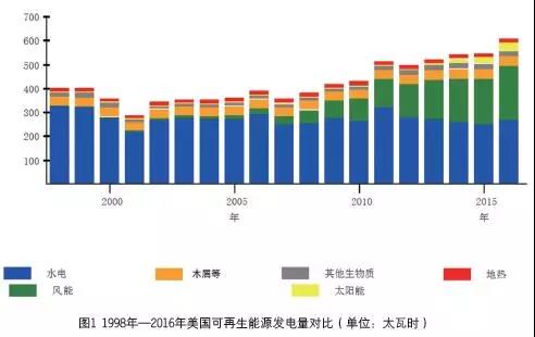 近年來,美國風(fēng)電、光伏的發(fā)展正在加速電力系統(tǒng)轉(zhuǎn)型。風(fēng)電和光伏裝機(jī)迅猛增長,使水電占可再生能源電力裝機(jī)的比重自2014 年開始已經(jīng)低于一半。2016 年,美國可再生能源發(fā)電總量為6090億千瓦時(shí),占電力的比重為14.94%,超過了原定2020年達(dá)到12%的目標(biāo),其中非水可再生能源電力占比達(dá)8%。2017年,美國公用事業(yè)新增發(fā)電裝機(jī)約為2800萬千瓦,其中的近一半使用可再生能源技術(shù),主要是風(fēng)能和太陽能。