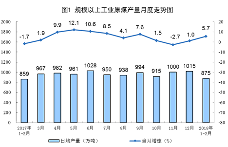 1-2月份,原煤產(chǎn)量5.2億噸,同比增長(zhǎng)5.7%,去年同期為下降1.7%;日均生產(chǎn)875.1萬(wàn)噸。