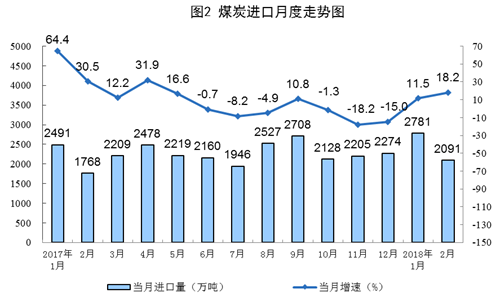 1月份和2月份分別進(jìn)口煤炭2781和2091萬(wàn)噸,同比增長(zhǎng)11.5%和18.2%。