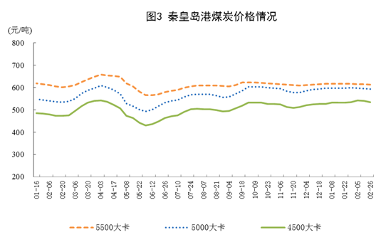 截至2月底,秦皇島5500大卡煤炭平倉(cāng)價(jià)為每噸613元,比去年年底下降4元;5000大卡每噸593元,下降4元;4500大卡每噸535元,上漲8元,煤炭?jī)r(jià)格基本保持穩(wěn)定。