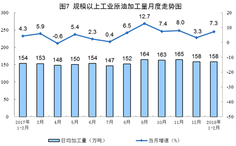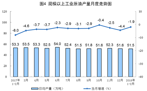 1-2月份,原油產(chǎn)量3037萬(wàn)噸,同比下降1.9%,降幅比去年同期收窄6.1個(gè)百分點(diǎn);日均產(chǎn)量51.5萬(wàn)噸。