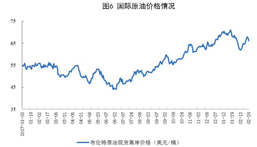 原油價(jià)格小幅震蕩。1-2月份,布倫特原油現(xiàn)貨離岸價(jià)格在60-70美元/桶間小幅震蕩。截至2月28日,價(jià)格為66.1美元/桶,比去年12月底下跌0.7美元/桶。