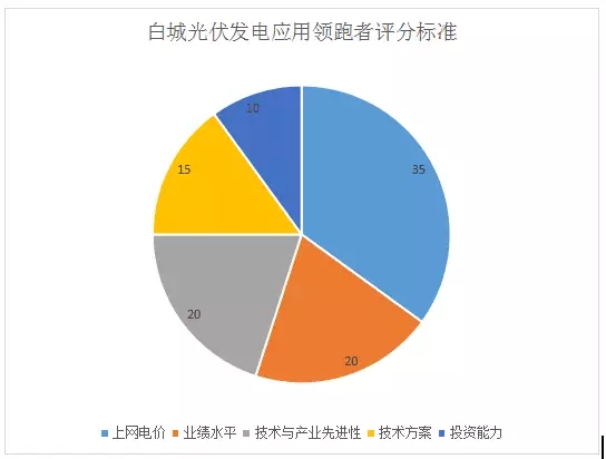 在白城光伏領(lǐng)跑者評分標準中,上網(wǎng)電價占35分,業(yè)績水平20分,技術(shù)與產(chǎn)業(yè)先進性20分,技術(shù)方案15分,投資能力10分。