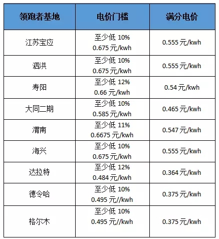 結(jié)合其余領(lǐng)跑基地所處太陽能資源區(qū)及電價門檻,計算可得滿分電價如下: