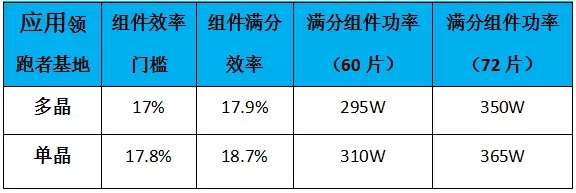 組件設(shè)備若想獲得滿分,多晶和單晶組件的轉(zhuǎn)換效率須分別達到17.9%、18.7%,按常規(guī)60型組件標準尺寸推算(5W功率為一檔),對應(yīng)的功率分別為295W和310W,72型組件則分別為350W、365W。