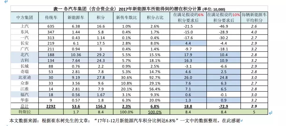 但是請不必驚慌,整個(gè)行業(yè)在2020年的積分供大于求的說法不無根據(jù)。在2019年,15家新興新能源汽車企業(yè)據(jù)估算有超過九十萬輛產(chǎn)能;而且許多合資企業(yè)也會推出它們的新能源車。別忘了特斯拉。2017年特斯拉在華銷量一萬六千七百多輛車,以每輛車五分計(jì)算,可達(dá)八萬四千新能源車積分,占表一所有積分盈余企業(yè)中的第四位,可對積分市場起到一定的穩(wěn)定作用(見表一最后一行)。我覺得特斯拉假如真能在中國的新能源車積分市場分一杯羹的話,也證明了該市場的開放性。