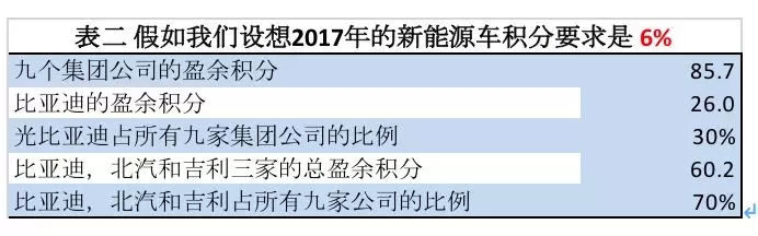 假如我們設(shè)想2017年實(shí)行6%的新能源汽車積分政策,在表一中共有9個(gè)集團(tuán)公司有盈余積分。比亞迪的盈余積分占可交易的全部盈余積分的30%。比亞迪、吉利和北汽集團(tuán)共占市場的70%(表二)。