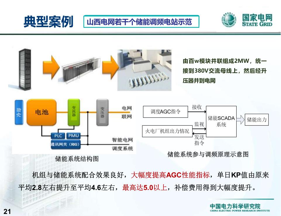 下面我們介紹一下山西這幾個電站,從技術(shù)上給大家展示一下。大家可以看出,原理是一樣的,我把儲能和火電機組配合起來,把指令進(jìn)行分解,能起到什么效果呢?常規(guī)的火電機組KP值各個地方不太一樣,一般是2.8左右或者3左右,借助儲能以后可以得到大幅度提升,到4左右甚至5,這就是儲能參與調(diào)頻的基本原理。