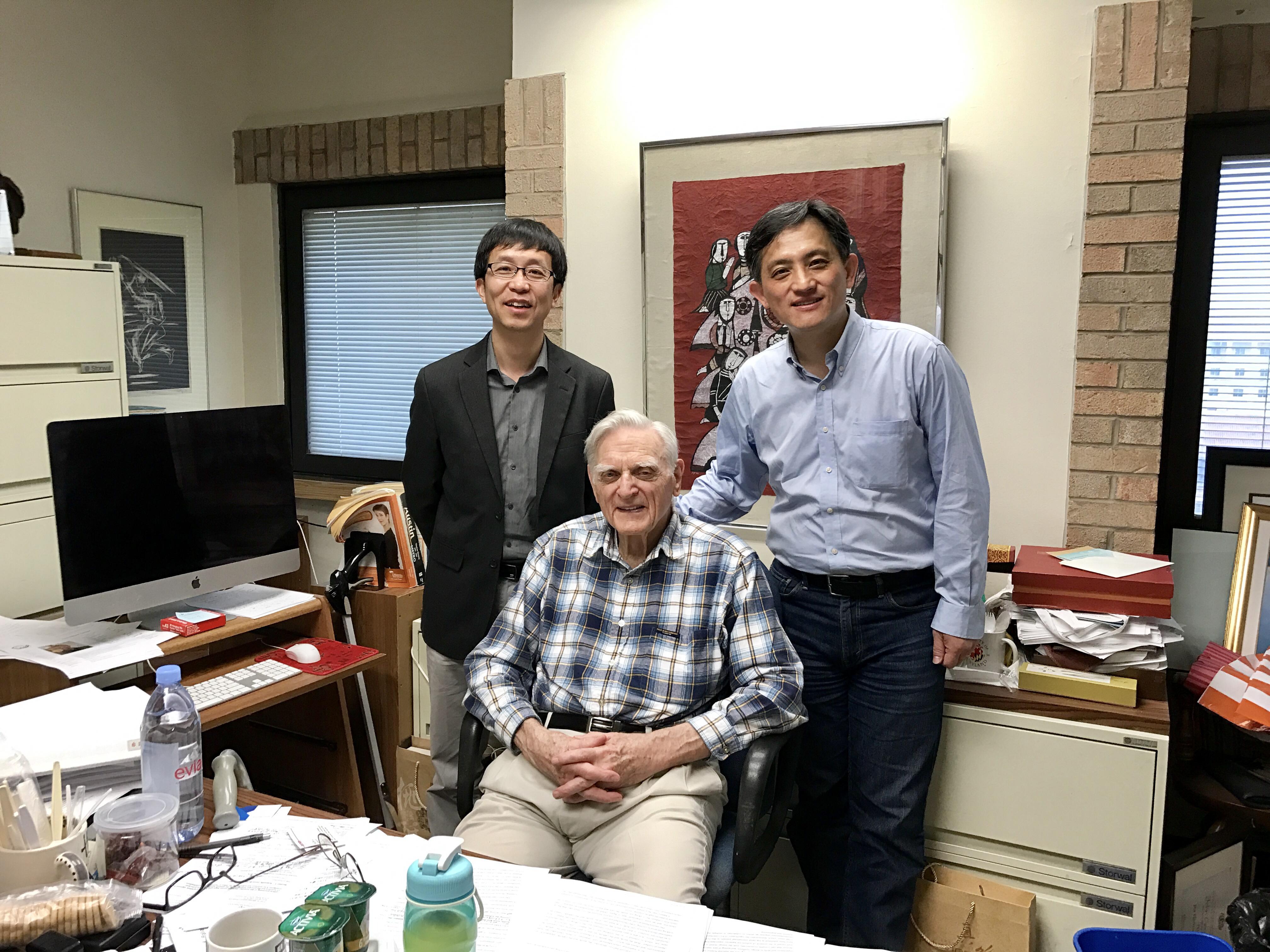 車勇(后左)、恩力總裁戴翔博士(后右)與“鋰離子電池之父”約翰·古迪納夫(John Goodenough)教授(前)合影