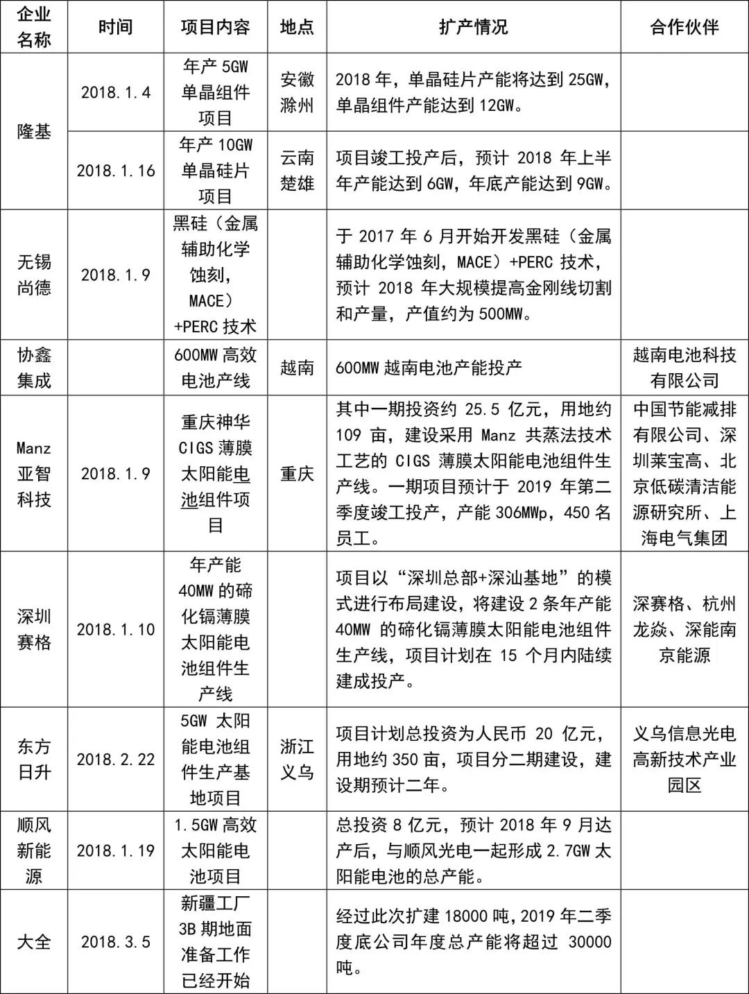 表 1 2018年1-2月國(guó)內(nèi)部分光伏企業(yè)擴(kuò)產(chǎn)情況