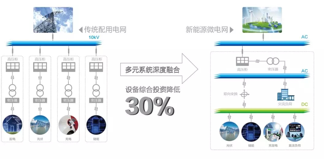 我們把配電、光伏、儲(chǔ)能、充電等電力電子設(shè)備高度集成,做到一個(gè)箱變里面,外面接10kv,配交流和直流兩條母線,交流的負(fù)載做到交流母線上,直流的負(fù)載做在直流母線上,這樣一個(gè)箱變就解決了四個(gè)箱變的問題,用一個(gè)箱變的投資代替四個(gè)箱變的投資,設(shè)備的綜合投資包括占地面積、集約程度都會(huì)有一個(gè)很大的進(jìn)步,就會(huì)形成一個(gè)高度集成的系統(tǒng)。