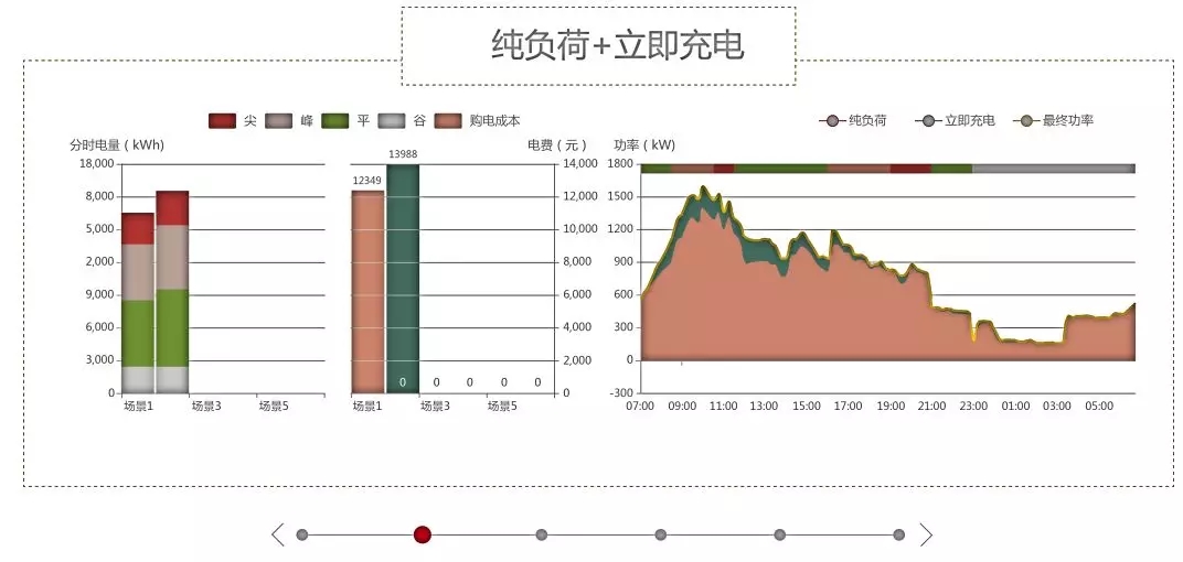上圖是園區(qū)最初的用電情況。左邊是用電負(fù)荷,中間是電費(fèi)情況,綠色的圓柱代表的是廠區(qū)的純負(fù)荷,加上引進(jìn)電動(dòng)車之后的無(wú)序充電,從右側(cè)的圖中可以看到,上午的時(shí)候峰值很高,夜晚谷電的時(shí)候基本上無(wú)人使用,這也是大部分園區(qū)目前的用電情況。