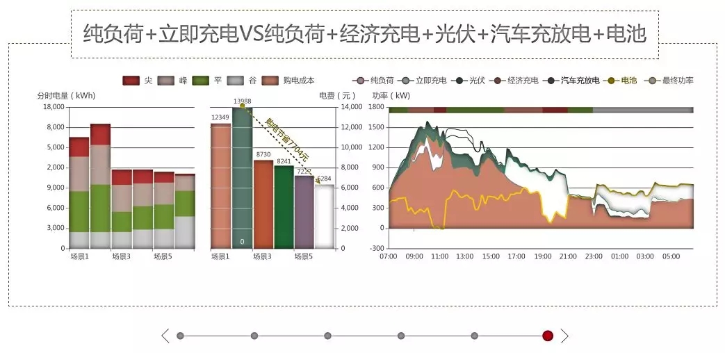 根據(jù)上述情況,我們把光伏引進(jìn)到微網(wǎng)中,園區(qū)的電費(fèi)直接降到了8730元;把車有序的充放電、儲(chǔ)能電池引進(jìn)之后,從右側(cè)的負(fù)荷情況中可以看到低谷時(shí)期的負(fù)荷比以前高了很多,尖峰的時(shí)候比以前低了很多,全天的負(fù)荷比較平滑,電費(fèi)也達(dá)到了50%左右的節(jié)能開支,可以說在微網(wǎng)的應(yīng)用上取得了一定的成功。
