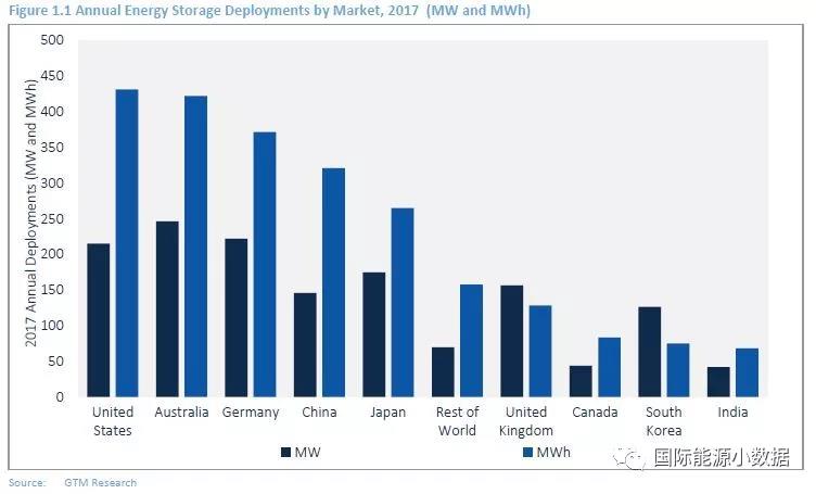 中國儲能網(wǎng)訊:根據(jù)GTMResearch日前發(fā)布全球儲能報告,2017年全球新增儲能容量1.4吉瓦、電量230萬千瓦時。從容量的角度來看,澳大利亞新增246兆瓦,居全球首位;從電量的角度看,美國新增43.1萬千瓦時,居全球首位。2017年中國的新增儲能容量約為150吉瓦/32萬千瓦時。