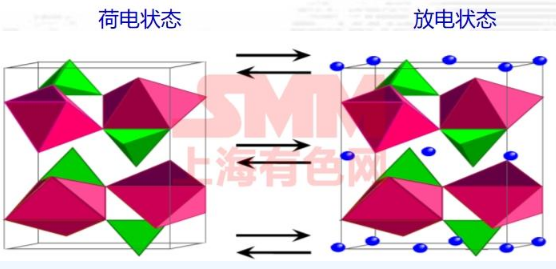 充電時(shí),鋰離子從FeO6層面間遷移出來(lái),經(jīng)過(guò)電解液進(jìn)入負(fù)極,發(fā)生Fe 2+→ Fe 3+的氧化反應(yīng),為保持電荷平衡,電子從外電路到達(dá)負(fù)極。放電時(shí)則發(fā)生還原反應(yīng),與上述過(guò)程相反。即: