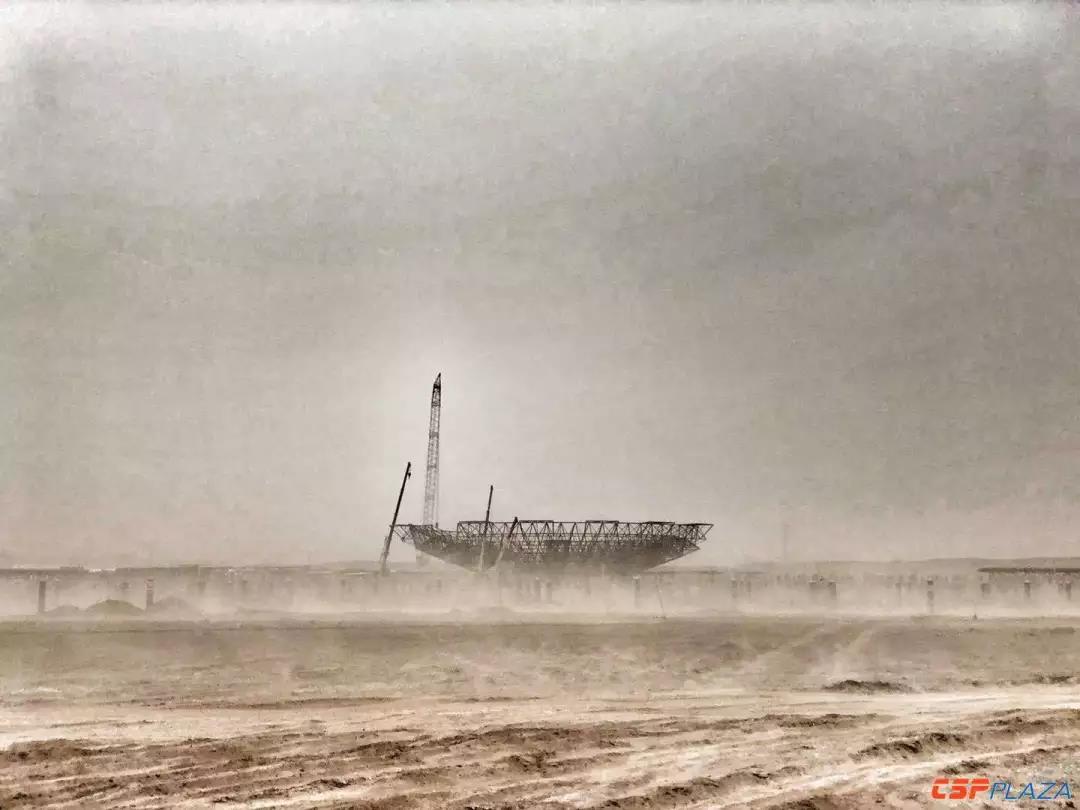 中國儲能網(wǎng)訊:這不是科幻電影,這是在建的玉門鑫能50MW二次反射熔鹽塔式電站的建設場景(下圖),當天,沙塵暴侵襲了該項目地。