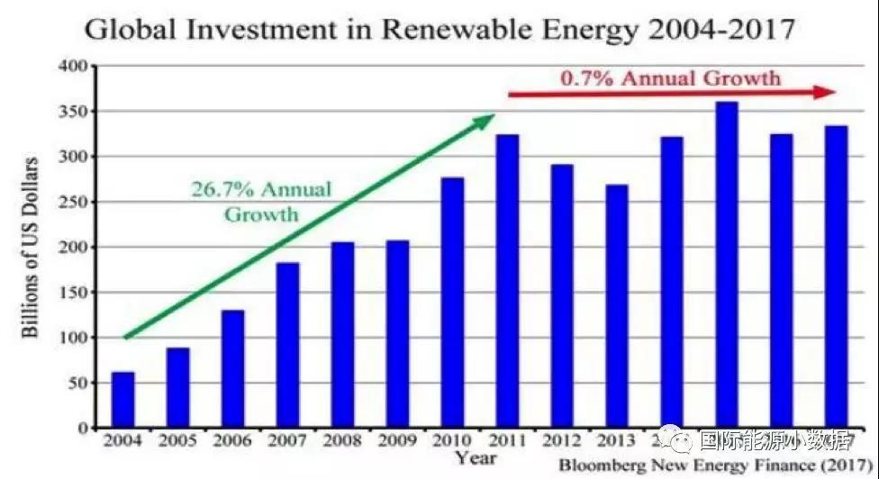 中國(guó)儲(chǔ)能網(wǎng)訊:根據(jù)彭博新能源財(cái)經(jīng)的數(shù)字,2004年到2011年間全球可再生能源投資年增長(zhǎng)率為26.7%。然而,2011年到2017年間全球可再生能源投資增長(zhǎng)率僅為0.7%。2017年日本可再生能源投資下降16%、印度下降20%、德國(guó)下降26%、英國(guó)下降56%。美國(guó)小幅增長(zhǎng)1%,而中國(guó)大增30%(1330億美元)??梢哉f(shuō),如果不是因?yàn)橹袊?guó)的巨大貢獻(xiàn),全球的可再生能源投資其實(shí)是在下降的。