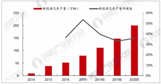 據(jù)前瞻產(chǎn)業(yè)研究院發(fā)布的《新能源汽車行業(yè)戰(zhàn)略規(guī)劃和企業(yè)戰(zhàn)略咨詢報告》數(shù)據(jù)顯示,2017年,我國新能源汽車產(chǎn)量為79.4萬輛,同比增長53.8%,占當(dāng)年汽車行業(yè)總產(chǎn)量(2,902 萬輛)的比例卻僅為2.74%。新能源汽車市場尚處于發(fā)展早期,未來受益政策推動、科技創(chuàng)新,產(chǎn)業(yè)快速成長的勢頭未來仍將持續(xù)十年甚至幾十年。預(yù)計,2018~2020年,我國新能源汽車產(chǎn)量將分別達(dá)到110.8萬輛、147.4萬輛、200萬輛,保持快速增長勢頭。